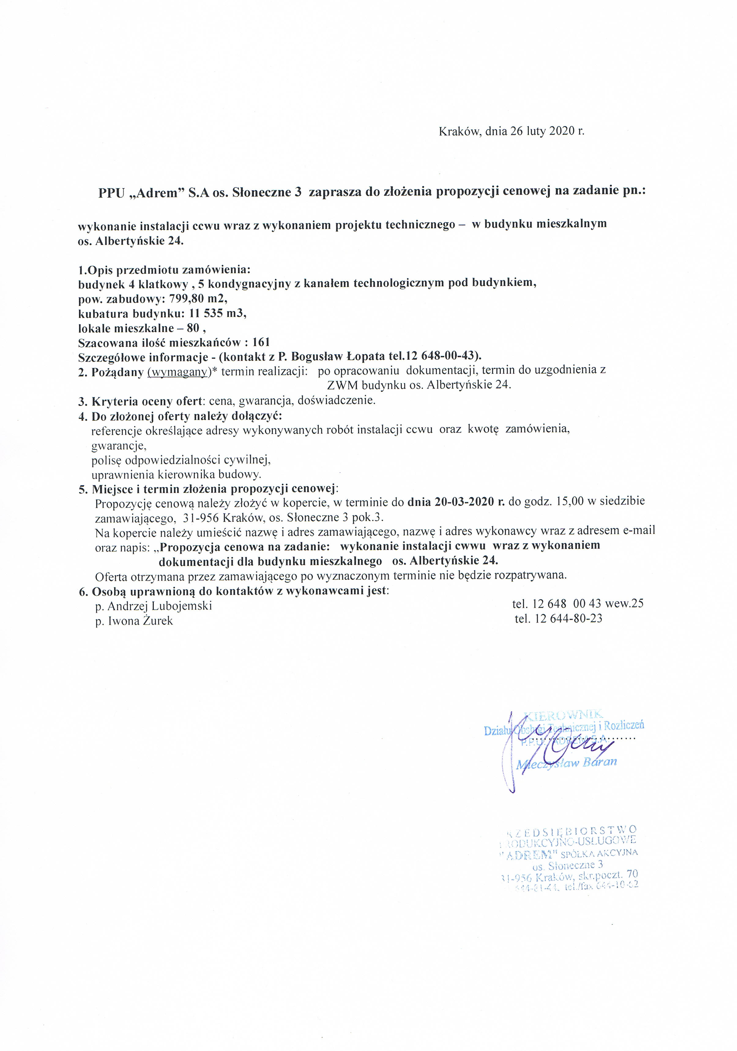 - Usługi pogotowia technicznego i C.O. dla budynku mieszkalnego os.Krakowiaków 5